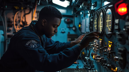 Young african american sailor working at control panel of ship or submarine, adjusting knobs and switches, focused on task