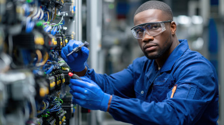 A man is shown working on a machine in a factory. This image can be used to depict industrial work, manufacturing, or technology in a factory setting.
