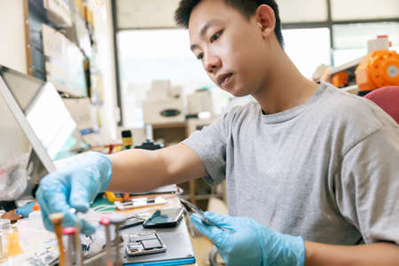Technician repairing the smartphone's motherboard in the lab. Showing process of mobile phone repair.