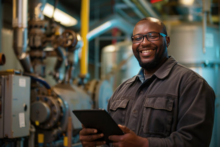 Experienced engineer in hard hat using a tablet, standing in an industrial plant with machinery in the background