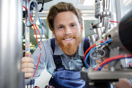 engineer worker fix service modern machine in hygiene medical factory