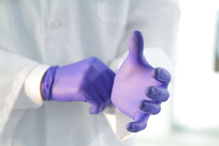 Banner closeup man wearing blue latex medical gloves on hands. Professional doctor putting on sterile protective gloves. Preparation for patient examination. Personal protection. Coronavirus COVID-19