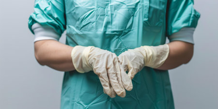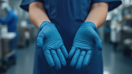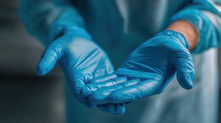 A person in blue gloves holding a pair of blue gloves. Generative AI image.
