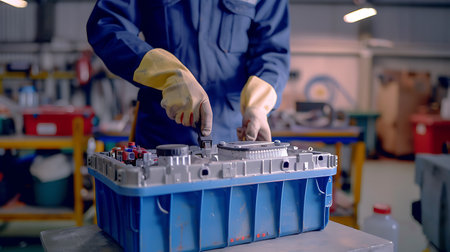 Close-up of a male worker in a blue uniform and gloves is repairing a battery in the workshop.