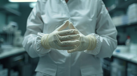 Surgeon putting on a glove. Close-up of a veterinarians hands putting on sterile gloves, demonstrating careful preparation for a surgical procedure in a veterinary operating room.