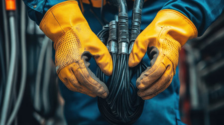 A worker in protective gloves holds a bundle of coiled electrical cables, emphasizing the importance of safety and professionalism in industrial settings.