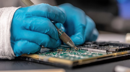 A close-up view of a technician wearing gloves as they carefully manipulate tools in a modern laboratory. The environment showcases a commitment to precision and safety.