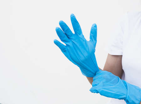 Crop close up of woman put medical rubber gloves against contagious Chinese corona virus pandemics, female wear protective hands gear from covid-19 epidemics, coronavirus, healthcare concept