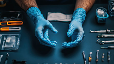 A man's hands in nitrile gloves handling medical equipment, focusing on the importance of hygiene.
