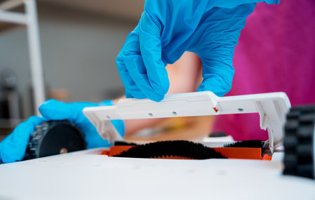 A young woman cleans a robot vacuum cleaner from dirt after cleaning.