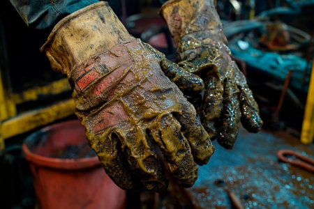 A worker stands with dirty, worn gloves, showing the signs of hard labor in a bustling workshop filled with tools and machinery. The gritty environment highlights a day of industrious work.