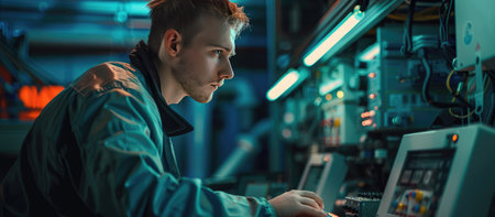 Closeup side view of early 40's male employee at a factory plant operating a production line machine and setting it for work.