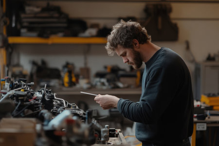 A man is focused on checking the oil level with a dipstick in a well-equipped workshop. Tools and vehicle parts are organized around him, highlighting his careful attention to detail.