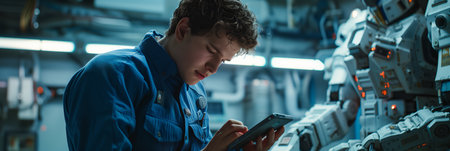 A man is shown working on a machine in a factory. This image can be used to depict industrial work, manufacturing, or technology in a factory setting.
