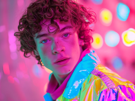 Teen White Man with Brown Curly Hair neon style Illustration.