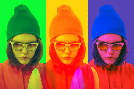 Art collage with alternative funky girl with overlay effect on bright multicolors background. Close up fashion portrait young beautiful woman in glasses. Unusual youth fashion concept.