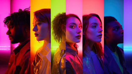 Collage of cropped male and female eyes placed on narrow stripes in neon lights.