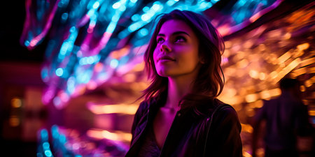 A person stands among neon colors and shapes, walking along a bright ribbon trail that flows through a digital space filled with holographic designs.