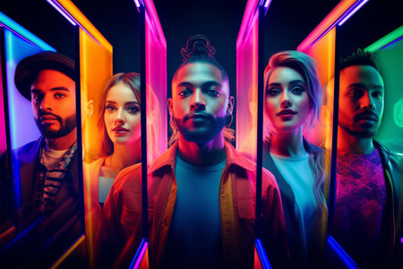 Close up portrait of young people in neon light. Human emotions, facial expression. People, astonished, screaming and crazy in happiness. Creative collage. High quality photo
