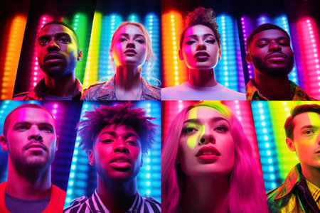 Collage of portraits of young smiling people isolated over multicolored backgrounds in neon light