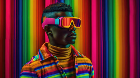 A person immersed in radiant psychedelic colors wears reflective sunglasses. The vibrant lights create a surreal atmosphere, enhancing the trance experience. Generative AI