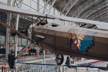 Brussels, Belgium - August 17, 2019: Morane Saulnier MS-315 aircraft in The Royal Museum of the Armed Forces and Military History, famous military museum in Brussels.