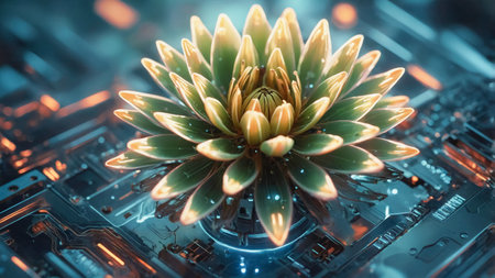 In a surreal environment, a radiant flower springs to life amidst glowing circuitry, showcasing a stunning blend of nature and technology. The atmosphere exudes tranquility and innovation.