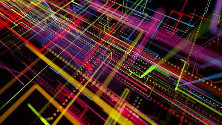 3d render. Sci-fi bg of glow multicolor particles form lines like electrical circuit or microcircuit. Beautiful bokeh light effects, dof. Abstract bg as technological concept with many lines and nodes