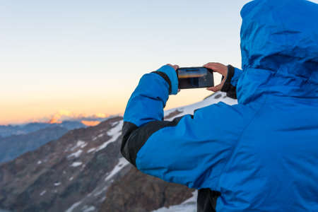mountain tourist with smartphone taking a picture of a glacier peaks at sunset