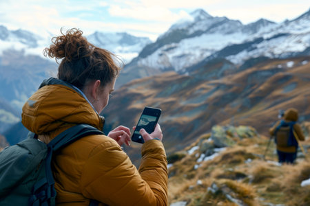 Close-up view of a hiker using smartphones GPS app in mountain travel. GPS becomes the hikers trusted companion, leading them to breathtaking views.