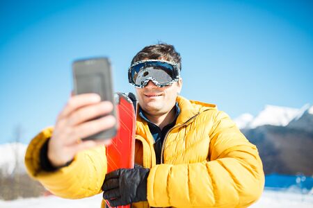 Horizontal view.Frame image of a snowboarder in winter sports clothes making selfie photo with his mobile phone at outdoors at the snowy mountains. Copy space.