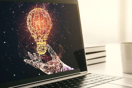 Creative light bulb illustration on modern computer monitor, future technology concept. 3D Rendering