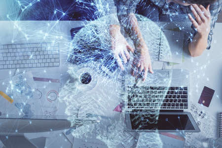 Double exposure of man and woman working together and data theme hologram drawing. Computer background. Top View.