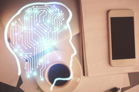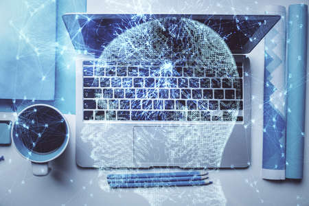Multi exposure of brain sketch hologram over topview work table background with computer. Concept of big data.