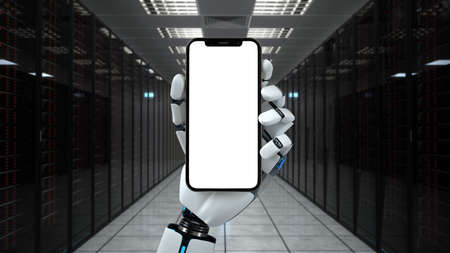 Close up of male hand holding smartphone with blank white screen in futuristic server room, copy space