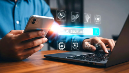 A male hand taps a smartphone screen featuring a glowing blue AI chatbot speech bubble asking how can i help you while typing on a laptop computer keyboard in the background.