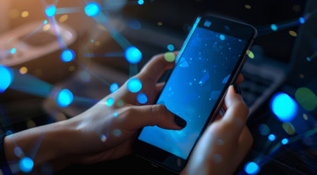 Generative AI : Closeup of man hands using smartphone at night with screen light searching or social networks hipster man typing to chat with his friend via social media apps on mo