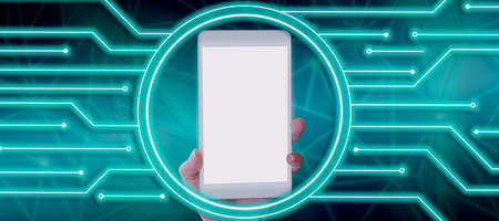 Businesswoman Hand Holding Cellphone In Digitally Generated Circle With Multiple Lines. Woman Presenting Effective Modern Technology With New Ideas And Information.