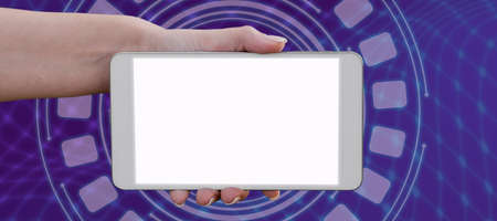 tablet in human hands, white screen, your picture here, with blue background. Top view