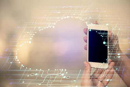 Double exposure of technology sketch hologram and woman holding and using a mobile device. Ai concept