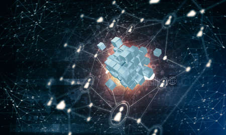 Conceptual background image with cube figure and social connection lines. 3d rendering