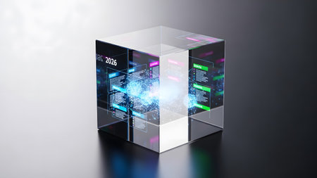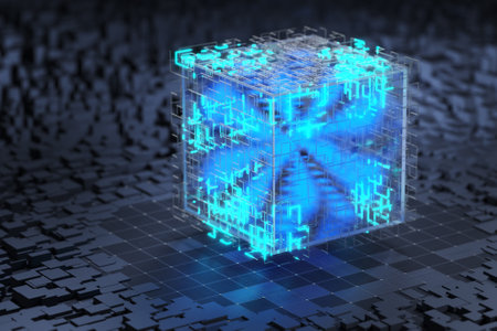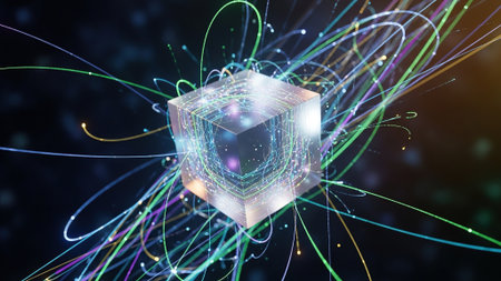 A clear cube showcases multiple glowing screens with text and a central bright digital network...