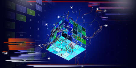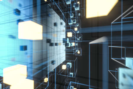 Abstract 3D illustration analyze algorithm big group cubes data. Quantum virtual cryptography. Virtual reality concept with wireframe boxes and bllured lines. Banner for business, science and technology. Artificial intelligence. Big data.
