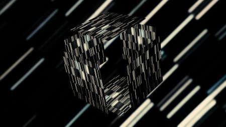 Futuristic black and white cube. Motion. Shimmering striped cube in cyberspace. Mysterious 3D cube is revealed in virtual space