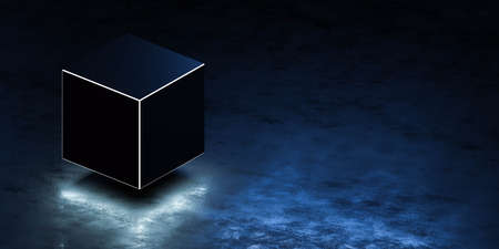 abstract cube geometric object flying over dark concrete surface 3d render illustration
