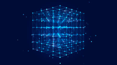Abstract technology background with lines connecting dots of poly cube and blurred lines. Analytics algorithms data. Big data. Quantum cryptography concept. Banner for business, science and technology.