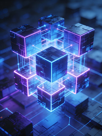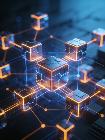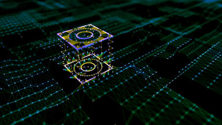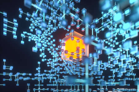 Blockchain in global digital network, quantum computer, nanotechnological circuit, high-tech processor and cybertechnology. 3D illustration of nanostructured data blocks in a secure server