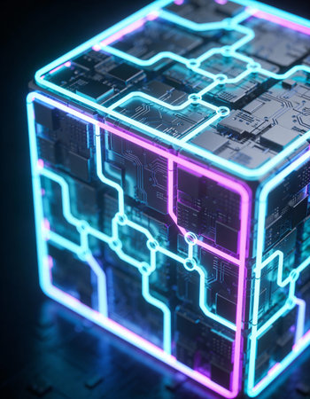 Complex 3D structure with interconnected blocks, circuitry patterns