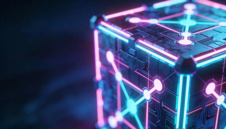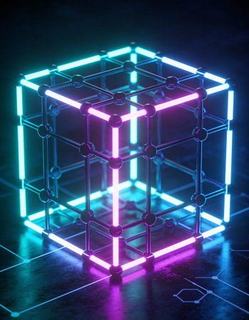 3d rendering of abstract cube with neon lights and reflections on dark background