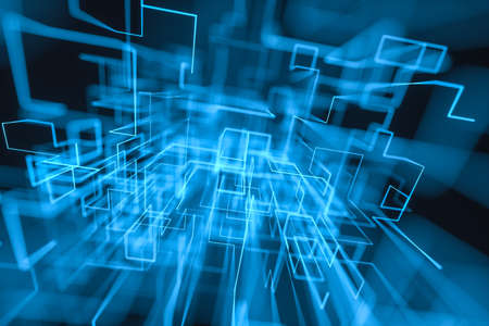 Glowing lines and cubes, technical and scientific background, 3d rendering. Computer digital drawing.